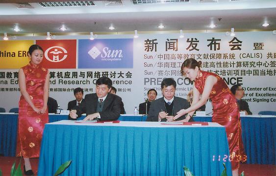 下午2點(diǎn),大會(huì)主辦方之一SUN公司舉行新聞發(fā)布會(huì),與賽爾網(wǎng)絡(luò)、華南理工大學(xué)、CALIC三方現(xiàn)場(chǎng)簽署了一系列合作協(xié)議。教育部科技司秦正先生、高教司葛道凱副司長(zhǎng)出席了協(xié)議簽字儀式。