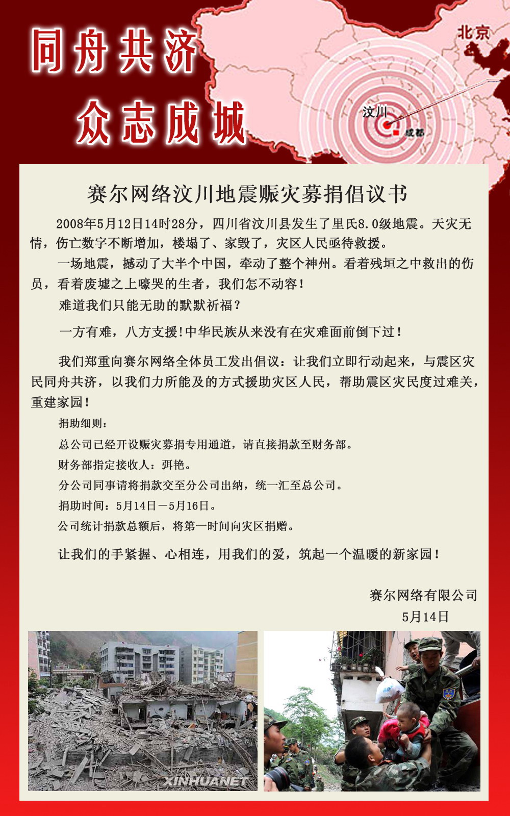 賽爾網(wǎng)絡汶川地震賑災募捐倡議書