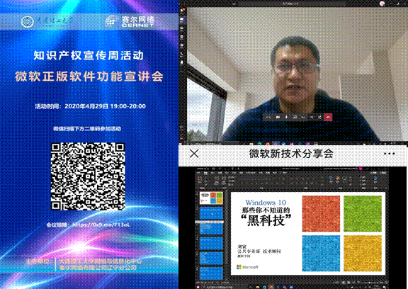 2020年4月29日,大連理工大學(xué)網(wǎng)信中心與賽爾網(wǎng)絡(luò)有限公司遼寧分公司在線上合作舉辦了主題為“微軟正版軟件功能宣講會(huì)”的活動(dòng)。此次活動(dòng)旨在宣傳知識(shí)產(chǎn)權(quán)保護(hù),提高學(xué)校的綜合信息化水平,同時(shí)為師生分享正版軟件的實(shí)用性技術(shù),營(yíng)造正版軟件的使用氛圍。