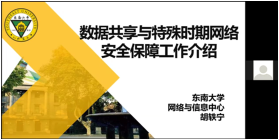 在安全領(lǐng)域有著豐富經(jīng)驗(yàn)的東南大學(xué)網(wǎng)絡(luò)與信息中心副主任胡軼寧,分享了東南大學(xué)通過(guò)數(shù)據(jù)共享推動(dòng)核心業(yè)務(wù)數(shù)據(jù)處理方面的探索,以及疫情期間網(wǎng)絡(luò)保障、信息化支撐及信息安全保障方面的經(jīng)驗(yàn)。