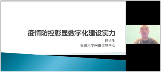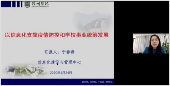 滁州學(xué)院信息化建設(shè)與管理中心主任于春燕,介紹了滁州學(xué)院疫情期間如何統(tǒng)籌支撐“防控”和“發(fā)展”。她說(shuō),信息化對(duì)學(xué)校的支撐作用日益重要,功夫在平時(shí);疫情防控與智慧校園要兩手抓,互相促進(jìn);培養(yǎng)一支能打硬仗的信息化隊(duì)伍。