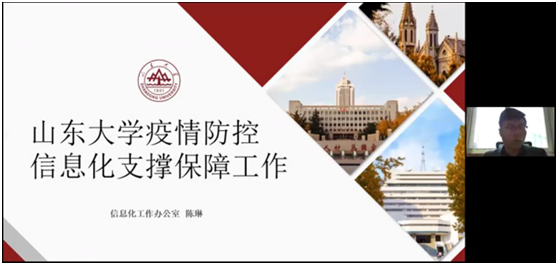 山東大學(xué)信息化工作辦公室網(wǎng)絡(luò)與技術(shù)服務(wù)中心副主任陳琳,通過(guò)線上教學(xué),連通校內(nèi)校外,掌上會(huì)議與辦公,疫情防控信息,創(chuàng)新信息化服務(wù),加強(qiáng)防控宣傳,日常風(fēng)險(xiǎn)防控幾個(gè)方面,分享了山東大學(xué)疫情防控信息化支撐保障工作。