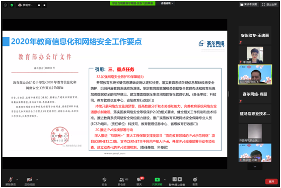 河南分公司副總經(jīng)理張東飛對(duì)2020年教育信息化和網(wǎng)絡(luò)安全工作要點(diǎn)和2020年高招網(wǎng)站安全檢測(cè)工作進(jìn)行了文件解讀,詳細(xì)介紹了高招檢測(cè)各高校應(yīng)上報(bào)的信息、上報(bào)流程、初檢復(fù)檢內(nèi)容和檢測(cè)時(shí)間節(jié)點(diǎn)等;同時(shí)還將CERNET目前的建設(shè)狀況以及各項(xiàng)服務(wù)內(nèi)容做了詳細(xì)匯報(bào),使各高校老師能夠更加充分認(rèn)識(shí)到接入CERNET的優(yōu)勢(shì)以及教育專網(wǎng)建設(shè)的重要性和必要性。