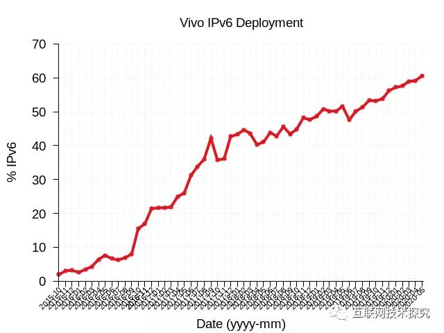 在巴西,當(dāng)?shù)刈畲蟮倪\(yùn)營商Vivo于2015年10月開始推行IPv6,5年內(nèi)IPv6部署率從0增長至60%(圖4)。