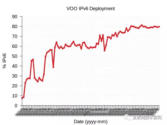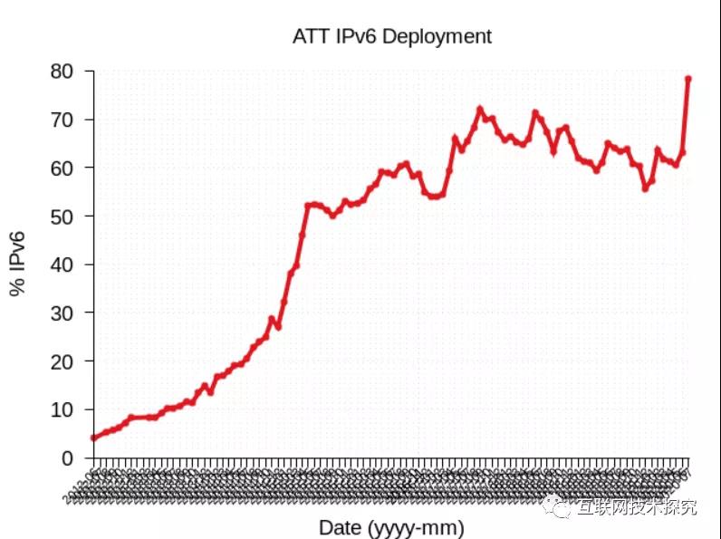 因此,他們的IPv6流量增加顯著,超過65%的用戶使用IPv6(圖9)。美國運(yùn)營商AT&T的IPv6部署率達(dá)到了80%(圖10)。